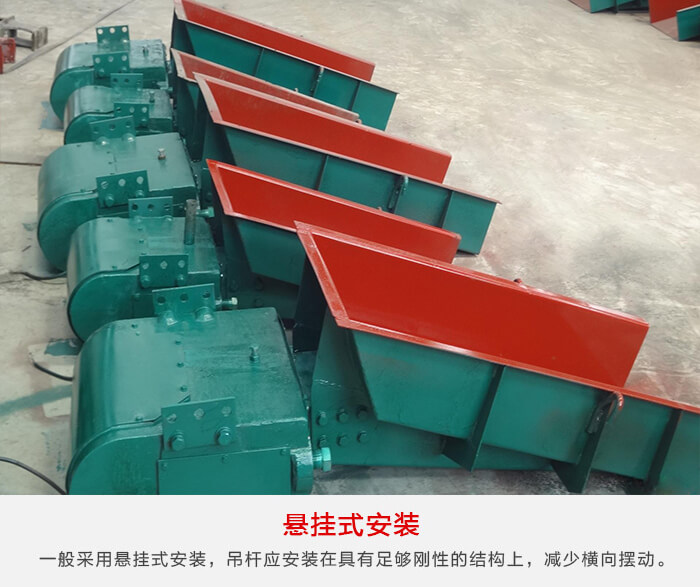 電磁振動給料機一般采用懸掛式安裝,吊桿應安裝在具有足夠剛性的結構上, 為了減少電磁振動給料機的橫向擺動, 懸掛吊桿應向外張開 10°左右布置。對于大型給料機, 為了維修和更換料槽方便,還應設置移動滑架。