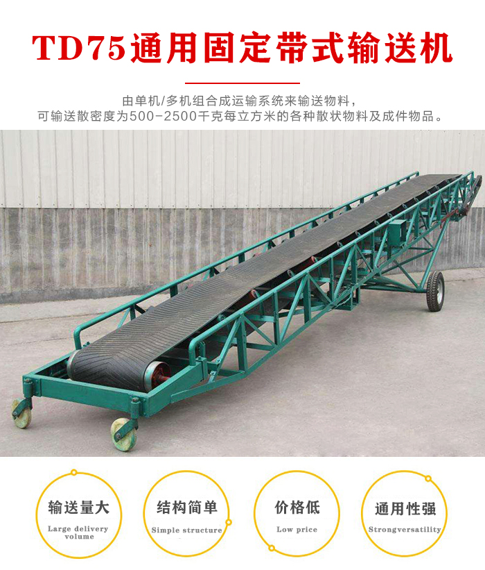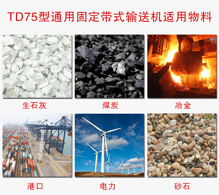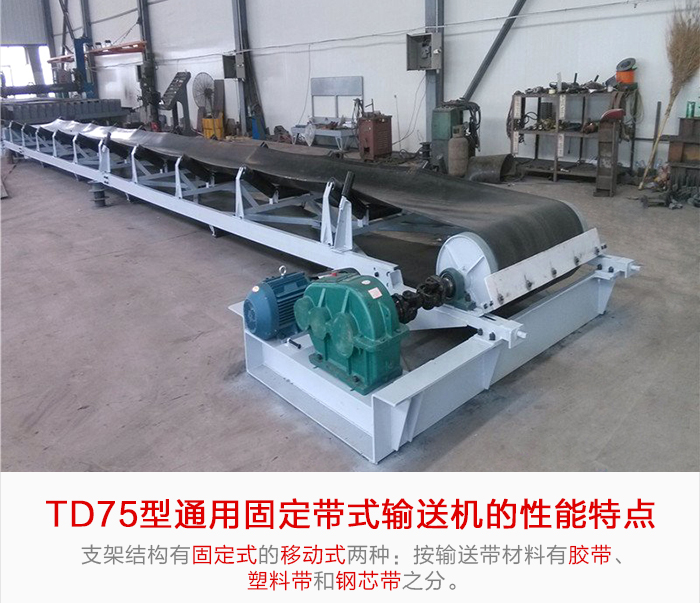 TD75通用固定帶式輸送機(jī)由于輸送量大、結(jié)構(gòu)簡(jiǎn)單、維護(hù)方便、成本低、通用性強(qiáng)等優(yōu)點(diǎn),而被廣泛地應(yīng)用在冶金、礦山、煤炭、港口、交通、水電、化工等部門(mén)進(jìn)行裝車(chē)、裝船、轉(zhuǎn)載或堆積各種常溫狀態(tài)的松散密度為500~2500kg/m3各種散狀物料或成件物品。