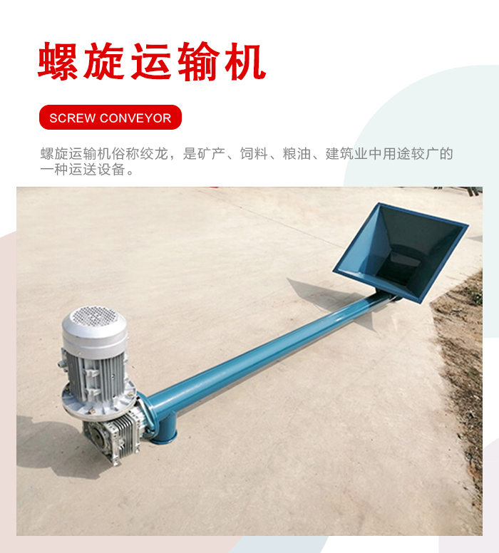 螺旋運輸機俗稱絞龍,是礦產(chǎn)、飼料、糧油、建筑業(yè)中用途較廣的一種運送設(shè)備,從運送物料位移方向的角度區(qū)分,螺旋運輸機分為水平式螺旋運輸機和筆直式螺旋運輸機兩大類型,首要用于對各種粉狀、顆粒狀和小塊狀等松散物料的水平運送和筆直提高。